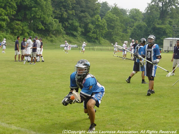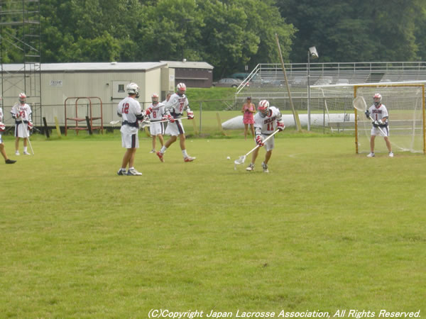 男子U19日本代表インサイドレポート・2003年7月2日 2003年7月2日:セミファイナル出場をかけて・vsイングランド戦 コータロー(小川)。 アップするイングランド。体格も大きく、スピード及びテクニックもある。 イングランド#13。足を負傷しているにもかかわらず、FaceOffはピカ一。ほとんどを取られてしまった。 審判から試合前説明を受ける(左から)、キム(木村)&タクミ(川瀬)バイスキャプテン、清水キャプテン。 敗退の晩。明日の韓国戦についてのミーティング。今日の結果を悔やんでも仕方がない。明日は全力を尽くすのみ。 (写真&レポート:2003年男子U19日本代表ゼネラルマネージャー・西本公俊)