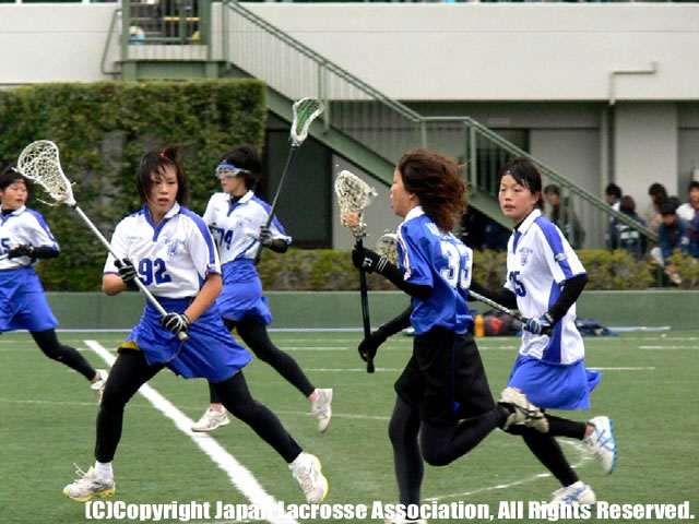 前半、開始早々から両者とも積極的にシュートチャンスを狙うが得点には結びつかず、力の差はないに等しいと思われた。その均衡を崩したのは関学。試合開始6分、フリーシュートが繰り返された末、#19寿賀が先制点を奪った。すぐに追いつきたい大国は、とてもユニークなパフォーマンスを見せながら攻め続け、#27松尾のナイスコースのシュートで同点に追いつき、観客を興奮させた。このシュートが大国に火をつけたのか、つづいて#1山本がすばやいシュートを決め、大国が一歩リードした。このまま大国のペースで行くかと思いきや、関学も少ないチャンスをものにし、#15馬田の同点シュートを決め、両者一歩も譲らない息の詰まるような展開が続き、そのまま前半が終了するかのように思われた。しかし前半残り2分、関学執念の逆転シュートを決め、3-2の関学1点リードで前半を折り返した。