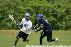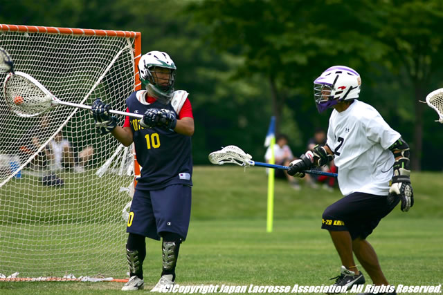 試合開始のフェイスオフを制したのは、東海#1矢後裕之。直後自らスクープする。手早く回してシュートという良い流れをつくるも、得点はならなかった。開始5分、東海のスラッシングで関東の人数有利になる。その中で、関東#11大野塁がグラウンドボールを獲り、ゴール裏を経由してのインバートで得点した。
