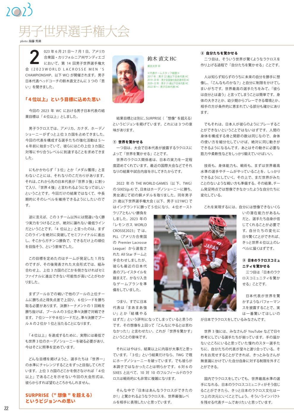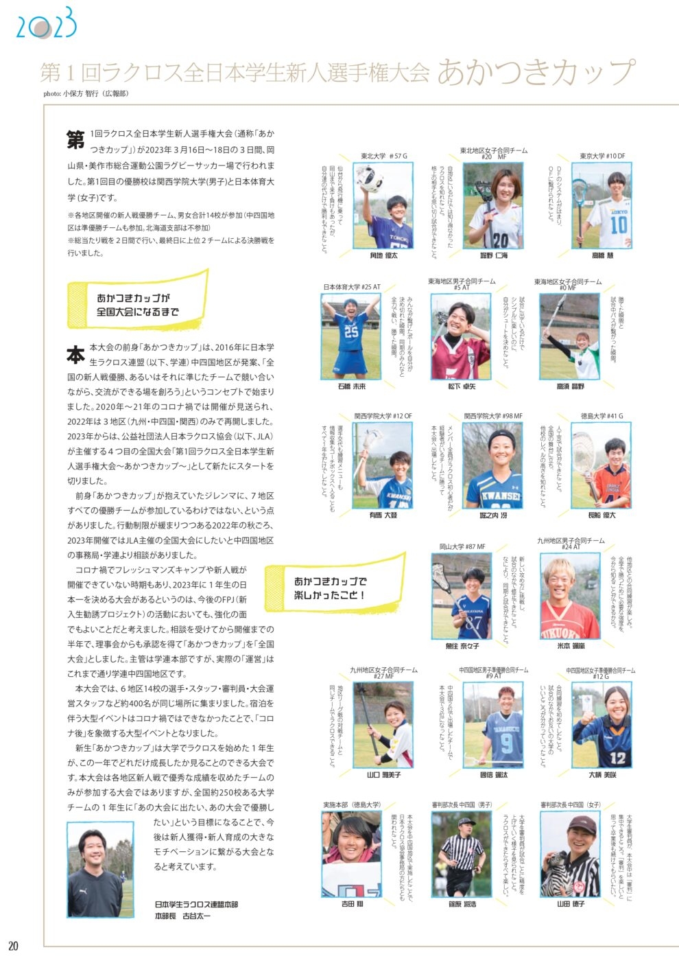この機関誌は、2022年度の報告と2023年度の事業について紹介する、日本ラクロス協会の年次報告書となっております。