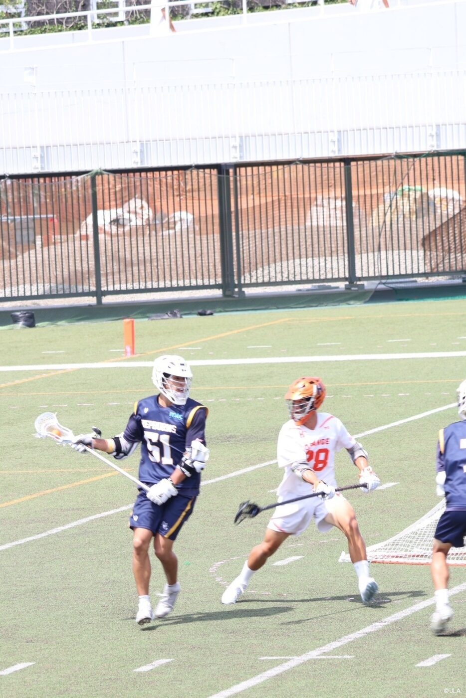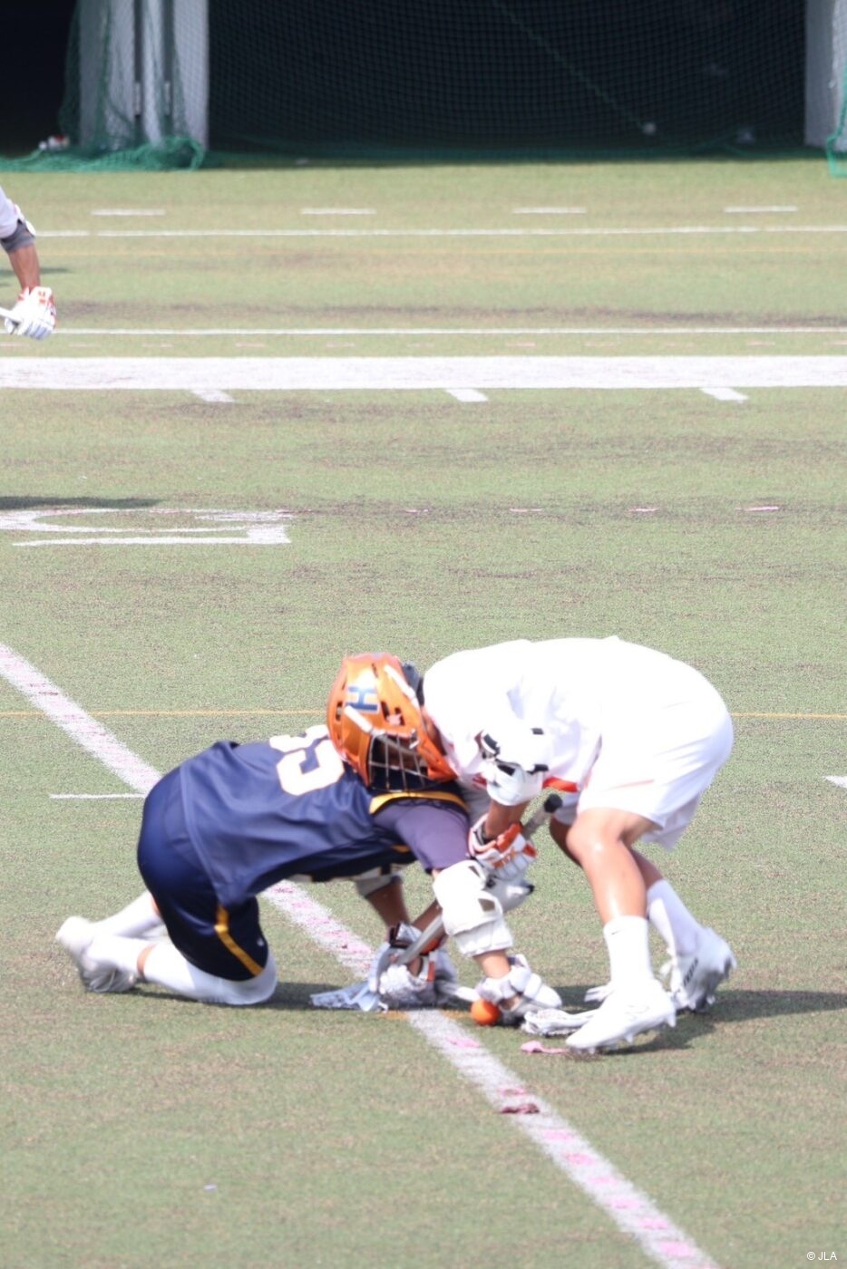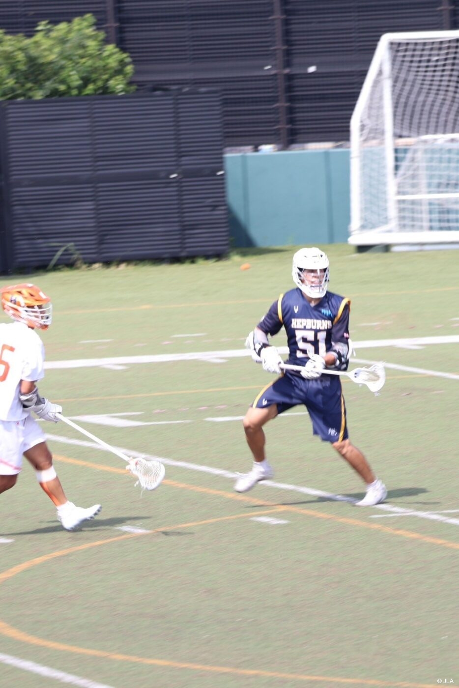 関東学生ラクロスリーグ1部開幕戦、気温38度の中熱い試合が始まる。猛暑のため、夏季試合催行のガイドラインに則り、試合時間は15分から12分に変更された。法政大学#46勝又健誠のフェイスオフブレイクから試合が始まるが、試合は拮抗。破ったのは明治学院大学(以下明治学院)。明治学院#24赤毛丈真がロールで切り込んでいき、先制点を挙げる。その後のフェイスオフ、激しい競り合いを明治学院#9柳田直也が制し明学ポゼッションで試合が再開する。その後も明治学院が主導権を握るも、得点は奪えず、0-1で1Qが終了した。