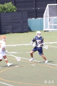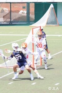 明治学院#9柳田直也がフェイスオフを獲得するも、うまくかみ合わず、法政ポゼッションから後半戦がスタートする。開始3分、明治学院はパスを回し仕掛ける機会を伺い、#17上田大貴が裏から、まくってシュートを決め、点差を5点に広げた。流れに乗る明治学院はトップでパスを回し、#51小峰拓真の強烈なシュートを放つも、法政#30福崎広大のファインセーブでなんとか守り切る。しかし明治学院の猛攻は止まらず、#17上田大貴がハーフラインから独走し縦抜きランニングシュートを決めリードを6点にする。その後、法政はチームタイムアウトを取り、反撃の狼煙を上げる。3Q11分、法政#82山田一輝の左ランシューによって1点を返す。このまま流れを掴みたい法政であったが、残り5秒の場面で明学#51小峰拓真が3人をかわし得点。3Qを7-1で終える。