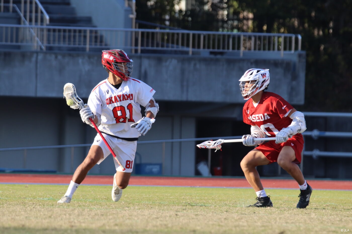 ラクロス日和な晴天の下、日清食品presentsラクロス全日本大学選手権大会準決勝、岡山大学(以下岡山)と早稲田大学(以下早稲田)の戦いが幕を開ける。最初のフェイスオフでポゼッションを獲得した岡山FO#4山下は、その勢いのままゴールへ一直線に走りシュートを撃つ。しかし、早稲田G#8長田の素晴らしいセーブにより防がれる。その後も果敢に攻め続ける岡山は、開始4分、岡山MF#20清水からパスを受けた岡山AT#1長野がシュートを撃つが、惜しくも枠外となる。ディフェンス時間が続いていた早稲田は反撃に出る。開始7分、早稲田MF#24三戸が左上から1対1を仕掛け、シュートを撃つ。しかし、これは岡山G#3嘉住が見事なセーブを見せる。その後開始9分、早稲田MF#16山﨑が裏から左横に駆け上がり、シュートを撃つ。これが、ゴーリーの足元に決まり、0-1と早稲田が先制する。追加点が欲しい早稲田は開始13分、早稲田AT#7小川からのパスをゴール前で受けた早稲田MF#13山口が冷静にゴーリーの頭上にシュートを決め、0-2と差を広げる。差を縮めたい岡山は、1Q終了間際、岡山AT#1長野が左上からシュートを撃つが早稲田G#8長田に阻まれ、得点とはならない。0-2と早稲田2点リードで1Qが終了する。